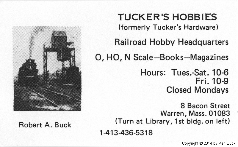 Transitional business card for the new hobby store. Although most hardware customers didn't buy shovels and house paint at the hobby store, most hobby customers had become accustomed to buying railroad books and models at the hardware store. The photo image was of Nickel Plate Road Berkshire #759, to be later replaced by a more appropriate B&A steam locomotive. The store was open late on Fridays until 9pm. During the 1960s and '70s, lingering customers on Friday nights were often invited to Bob's house to operate his model railroad, or watch railroad slide shows and movies. In later years, the Friday groups would adjourn to a local restaurant for a late dinner and storytelling sessions.